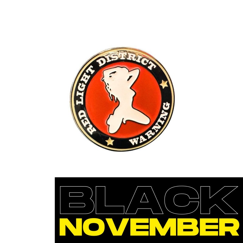 Ajoutez une touche rétro à votre collection avec le pins Pin-Up 5 Red Light District Warning (noir, blanc et rouge).