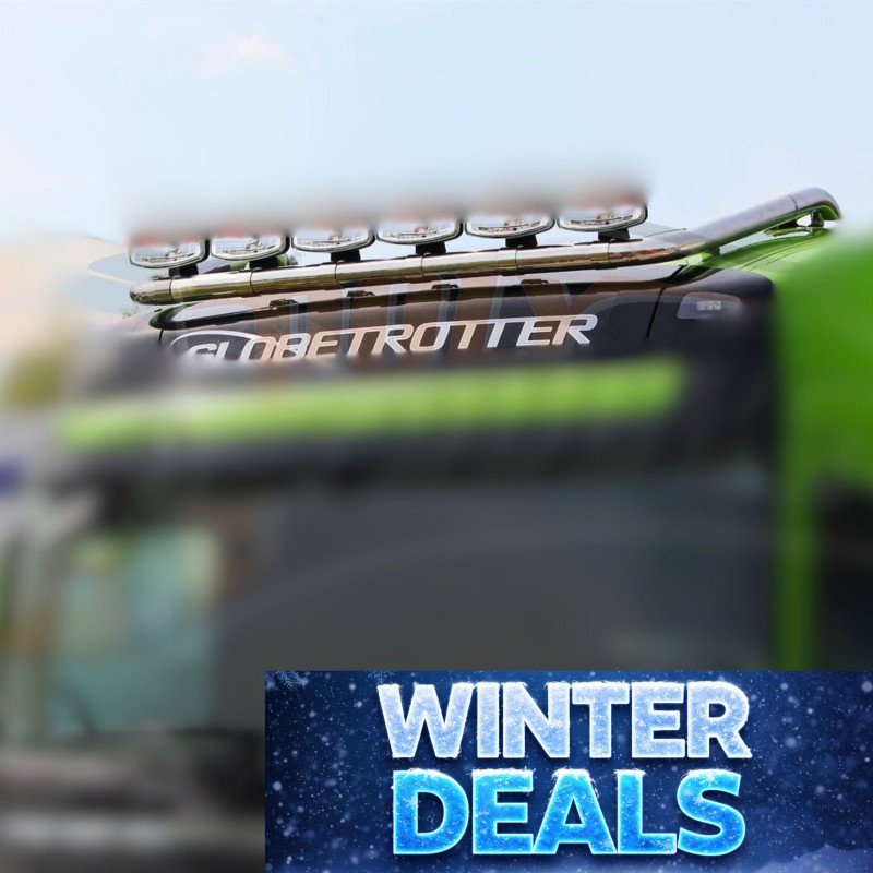 Équipez votre Volvo New FH avec la rampe de toit TOP en inox poli (⌀70mm): Finition brillante, 6 supports de phares, pré-câblage intégré et compatibilité Globe & XL et compatible avec un déflecteur en haut de la cabine